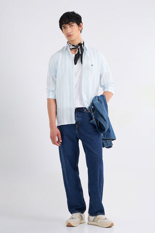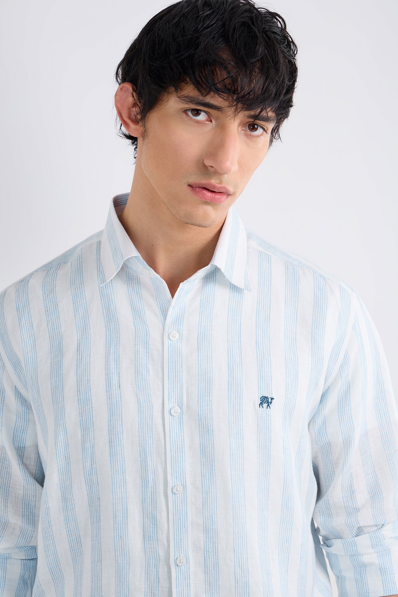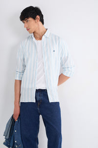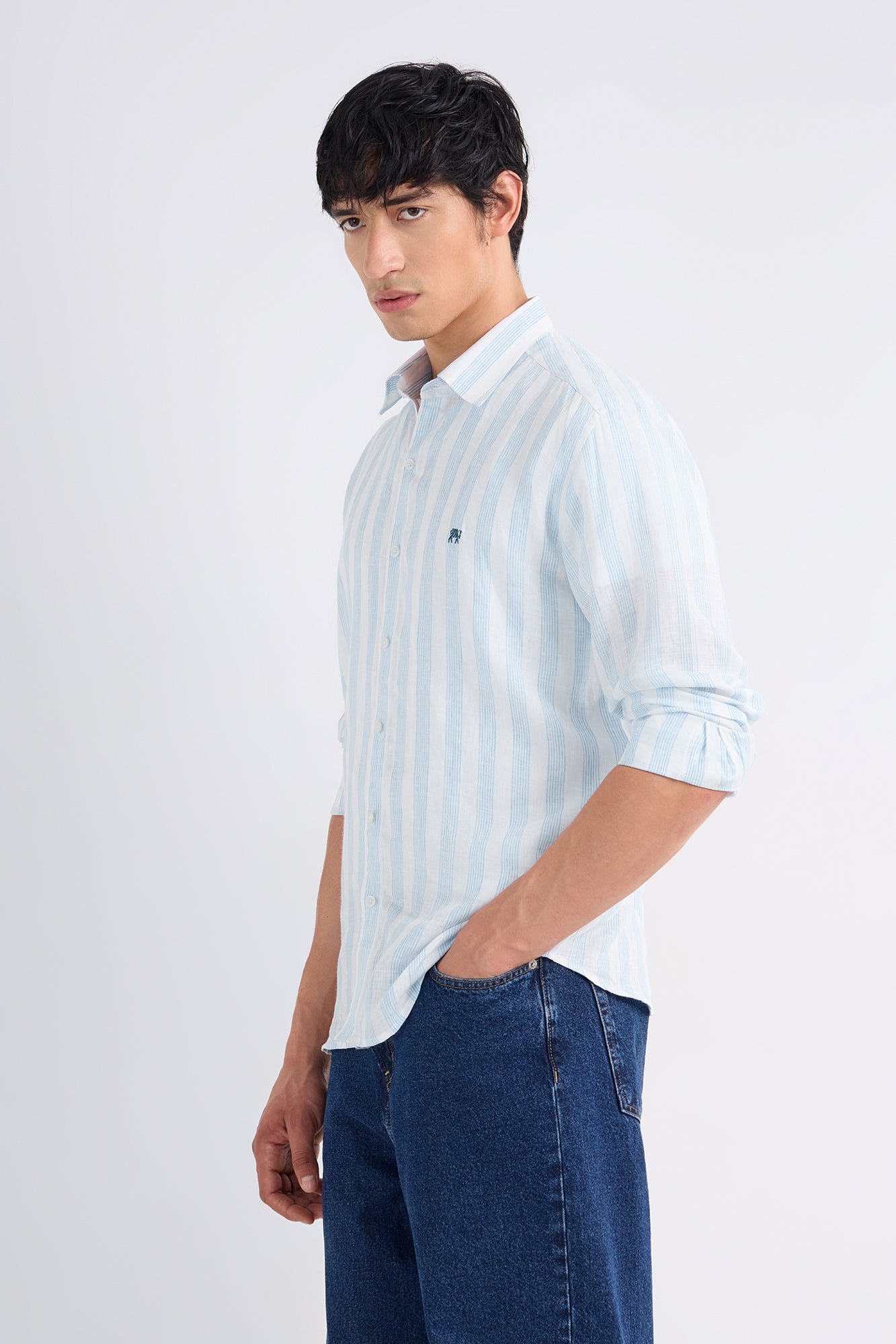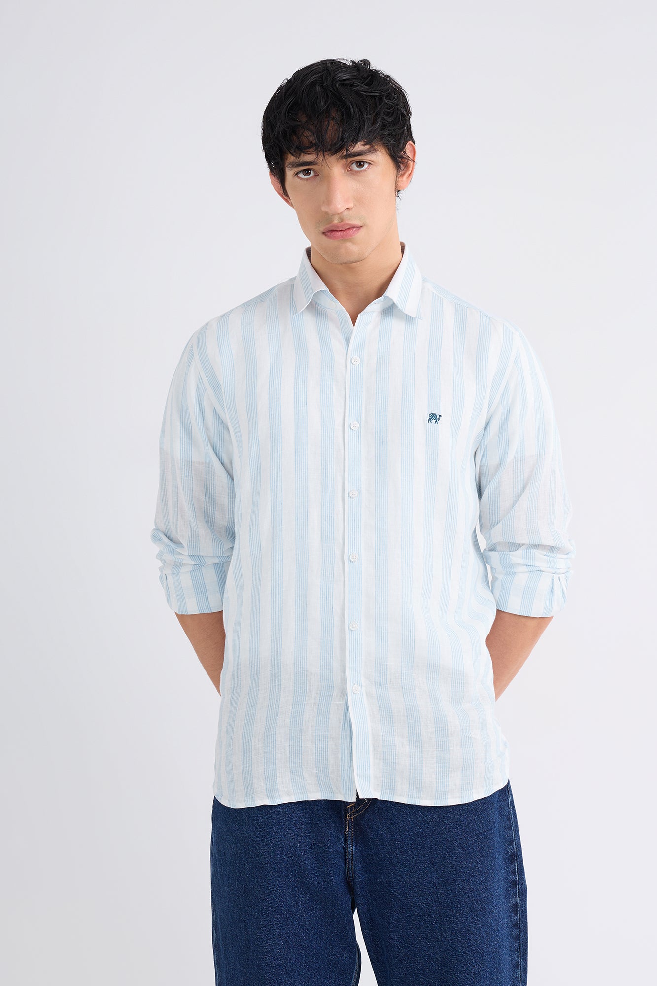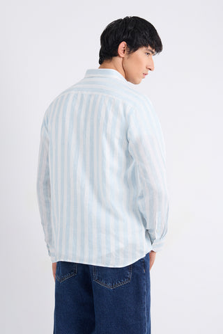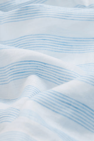 Premium linen woven with layered blue stripe bunches, creating a lively yet refined pattern.