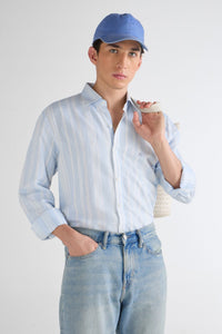 A premium blend of linen and viscose, this shirt offers natural breathability with a smooth finish. The blue and white stripes lend a timeless touch, making it versatile and elegant.